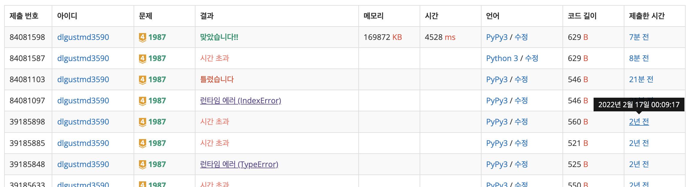 아무리 생각해도, set을 사용하는 과정에서 remove, in 등을 사용했기 때문으로 보인다. ( O(n) )
